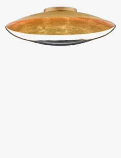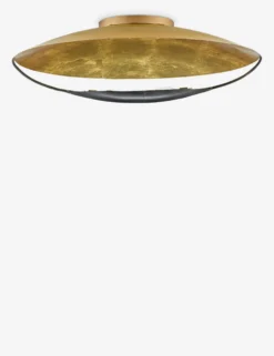 Style your look for luster with the Abel light. The bulb sits in a wrought iron strap reflecting warm tones off the gold-finished basin above. This flush mount fixture offers a brilliant statement feature for small-space design.