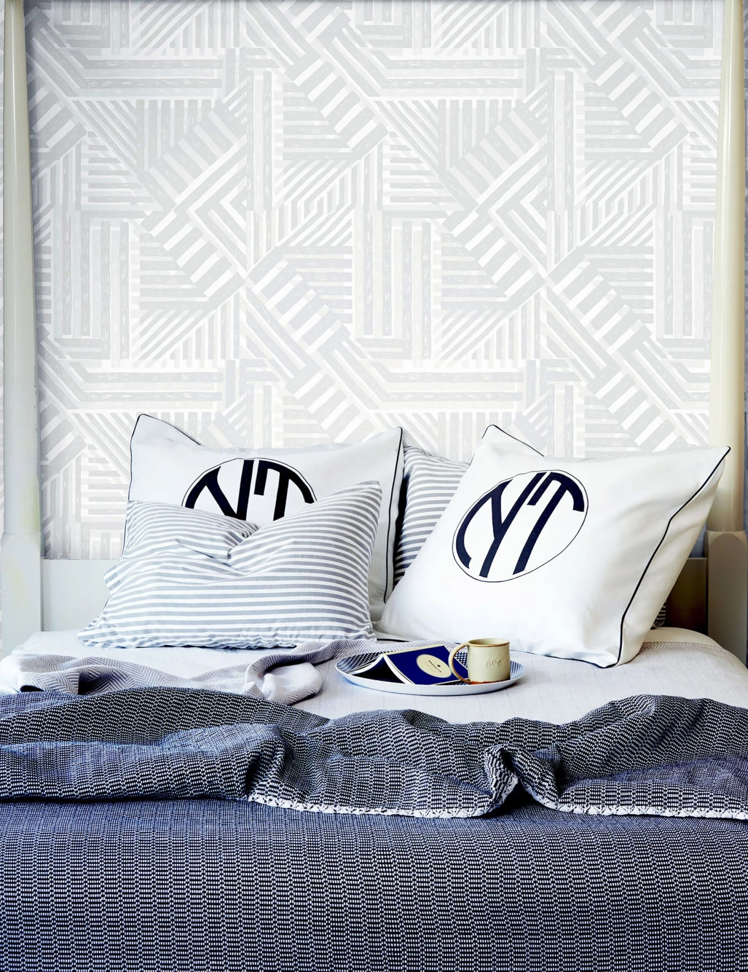 With inspiration from woodblock prints, this modern wallpaper features a striking geometric motif softened by a calming palette. We love the mesmerizing intricacy of this design for layering a fresh edge into your look—whether in a home office or dynamic lounge.