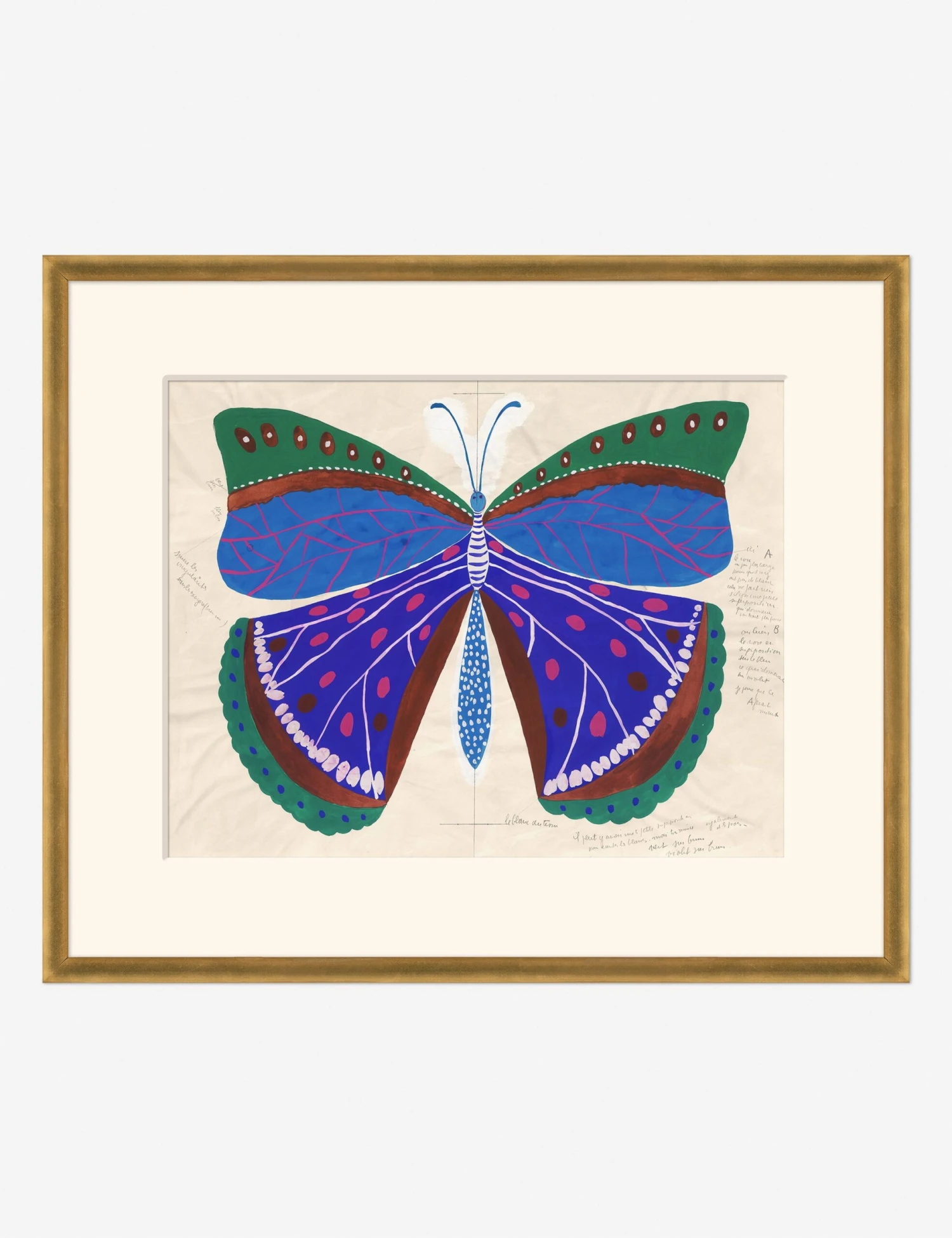 Elevate your wall decor with the iconic work of textile artist, engraver, and painter Paule Marrot. Each print captures her simple, lyrical style with boldness and fidelity—offering wall art with a fresh yet enduring appeal. This vibrant butterfly painting bears scrawled annotations, showcasing the artist’s process.