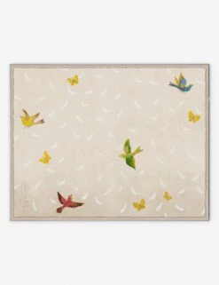 Elevate your wall decor with the iconic work of textile artist, engraver, and painter Paule Marrot. Each print captures her simple, lyrical style with boldness and fidelity—offering wall art with a fresh yet enduring appeal. Colorful birds amidst a scatter of feathers bring a delicate charm to this minimalist composition.