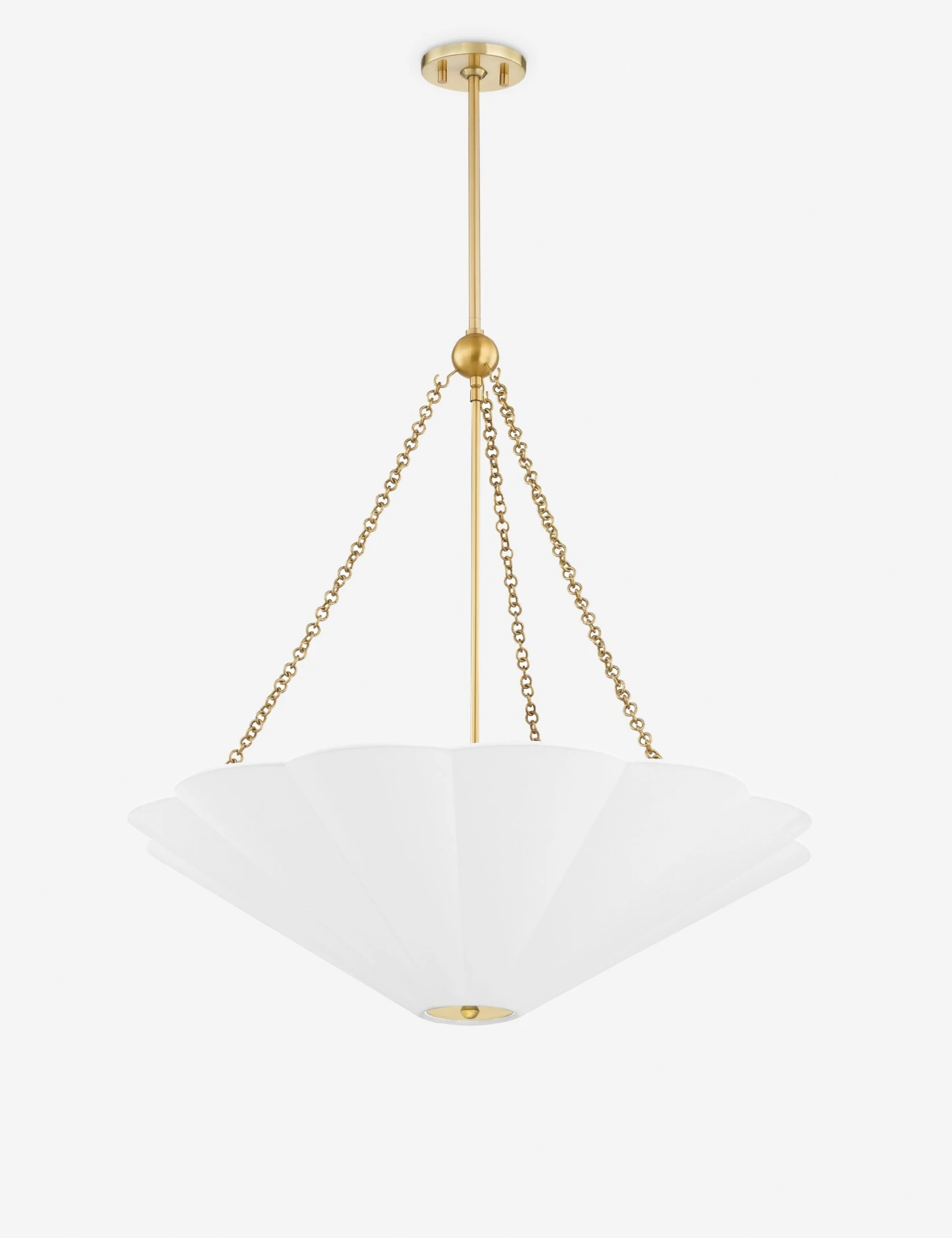 Refined touches really elevate the timeless silhouette of this pendant. A scalloped shade and chic chain detailing are this hanging light’s standout features, while its white and antique brass finish lets you fold this piece into your everyday look. Place it on its own in your lounge, or pair a few together in your dining room.