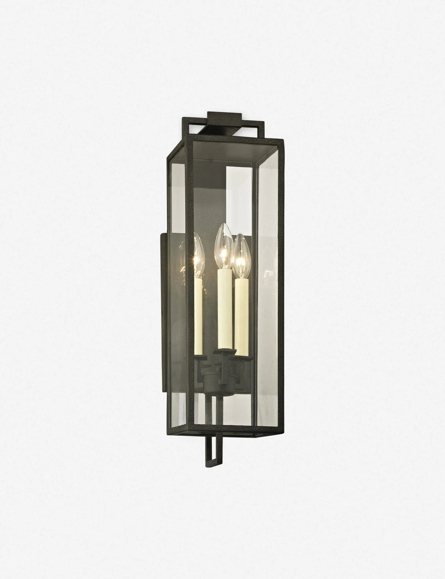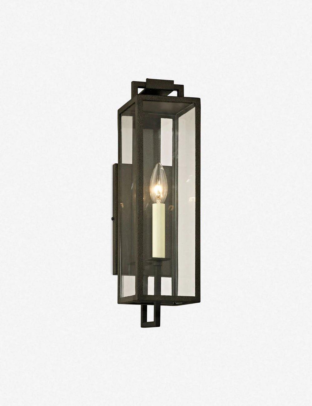 Bring a timeless touch of elegance to your indoor or outdoor space with this metal wall sconce featuring modern lines, glass paneling, and classic candelabra bulbs. Framing your entryway, from inside or outside, is our favorite way to style this sconce.