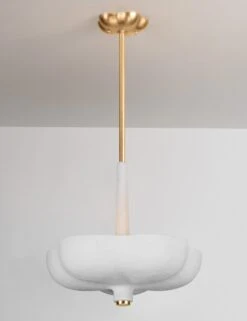 Nothing grounds modern decor like organic lighting. The Lacasa pendant is a study in soft elegance with its botanical form clad in a stark white gesso. Touches of gold leaf bring a polished finish to this stunning pendant light.