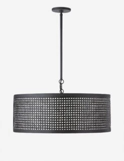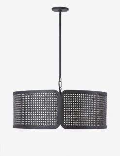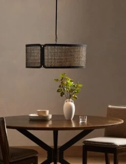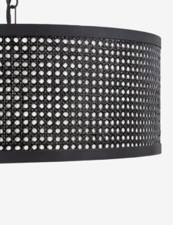 Vintage-inspired cane paneling is woven into a drum chandelier design with black iron framing to offer dramatic contrast and modern appeal. Beautifully textured and naturally chic, this chandelier provides a woven lighting statement for a transitional dining room or living space.