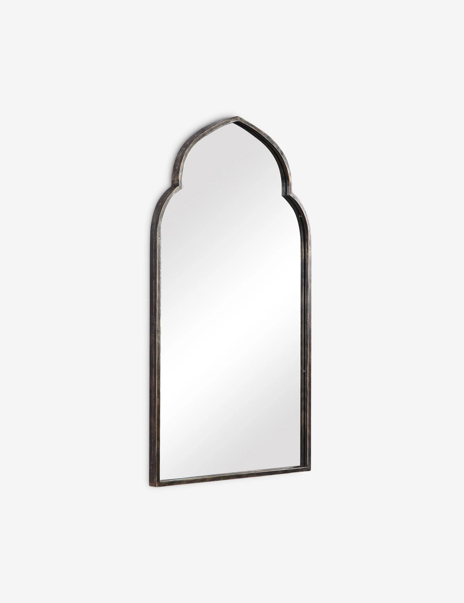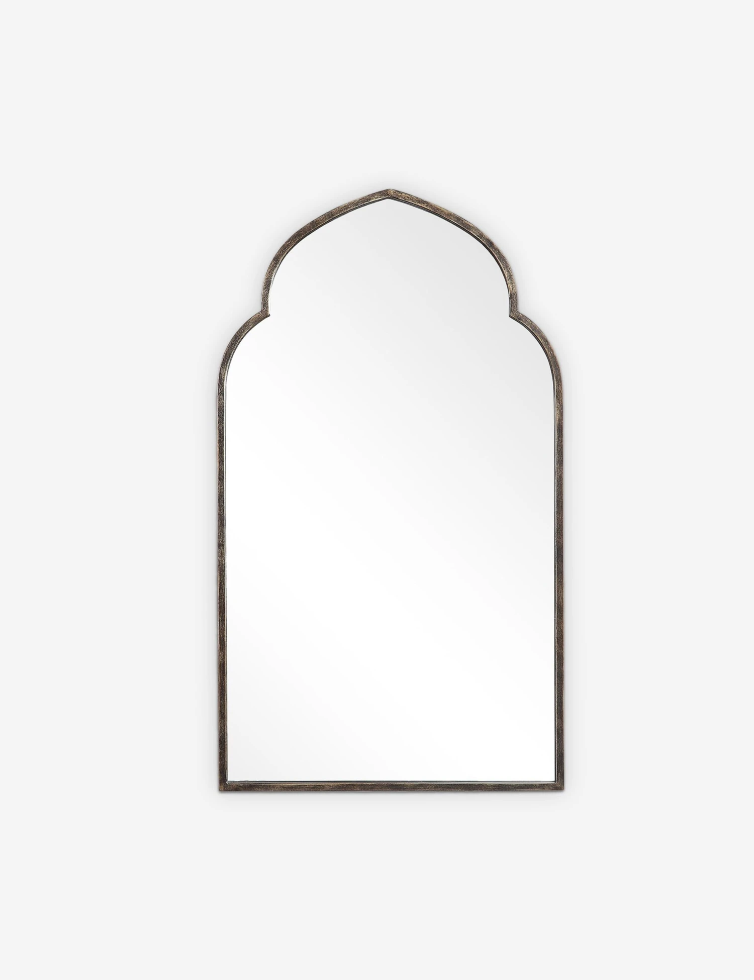 With its beautifully arched shape and an antiqued bronze finish, this decorative mirror looks like an exciting market find. The metal frame’s rich patina brilliantly reflects in the light, so we love the idea of placing this sculptural wall mirror above a mantel or console table.