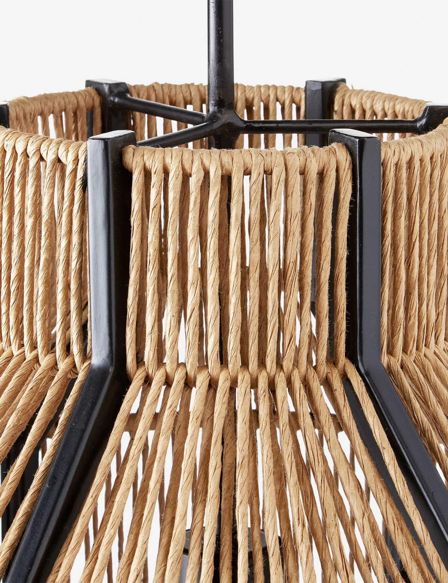 Artisan textures blend with modern elements in this eye-catching pendant light. The warmth of the twine brings a grounding touch to the sleek, wrought iron frame elevating both materials in an angular design. We love this pendant light for a grounding touch that can blend seamlessly into a modern space.