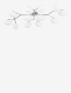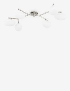 Six soft white opal glass shades are connected in a branching organic structure for a bright and natural touch of modern overhead lighting. This semi-flush mount light’s finish strikes a refined note that contrasts with the soft matte white of the opal glass for a ceiling light with dramatic visual impact.