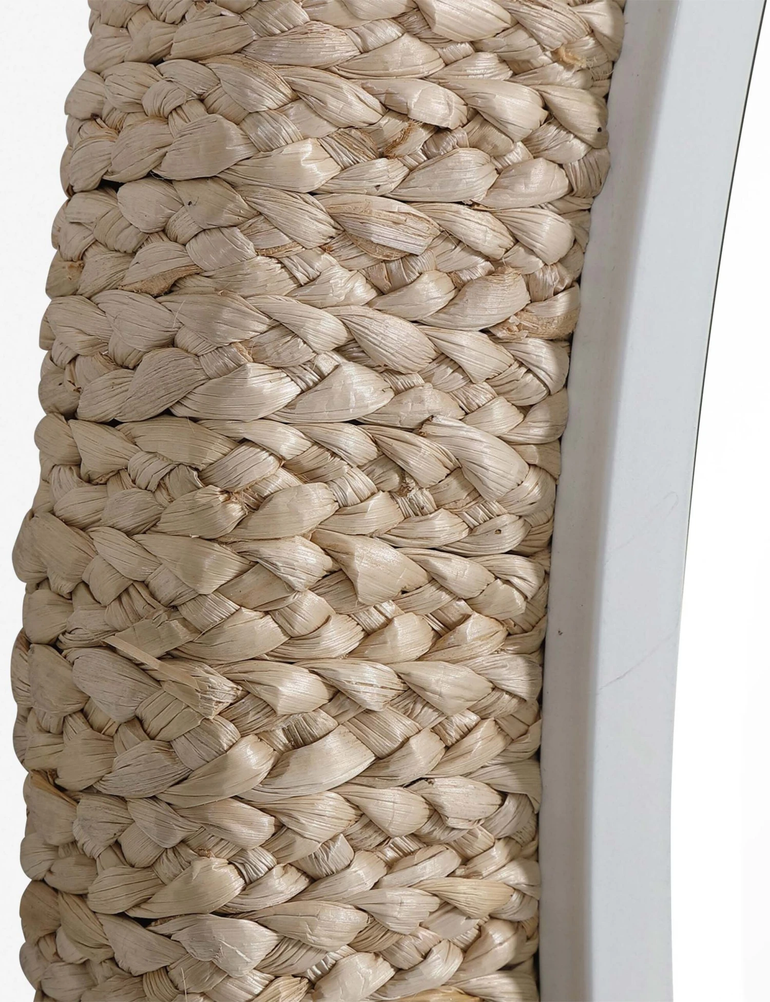 A woven banana leaf frame provides natural texture and fresh coastal tones to this wall mirror. With its beveled edge and round design, this decorative mirror is the perfect accent to elevate a laid-back decor blending organic elements with modern style.