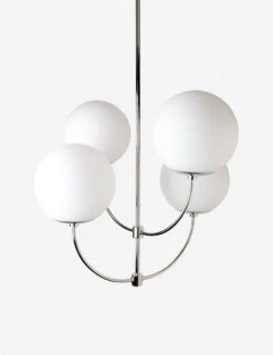 This unique ceiling light evokes an Art Deco feel, with four globe shades flowing out and alternatively staggered from its curved frame. Crafted from glass and polished nickel or antique brass finished metal, the shades’ opal matte finish softly diffuses light. We love this hanging ceiling fixture placed over a round dinner table, bar, or kitchen island.