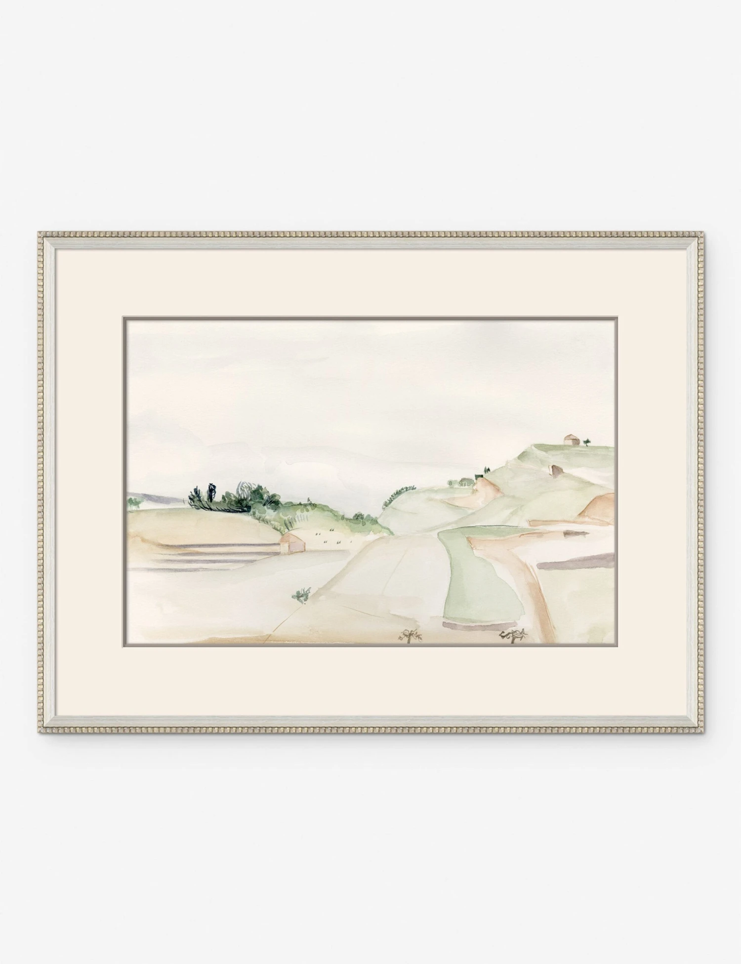 Depicting a calming farm landscape scene, this wall art print is an ideal addition to your space as its watercolor tones sit well with a more neutral aesthetic. Style this wall artwork alone above a console table or mix and match with coordinating landscapes.